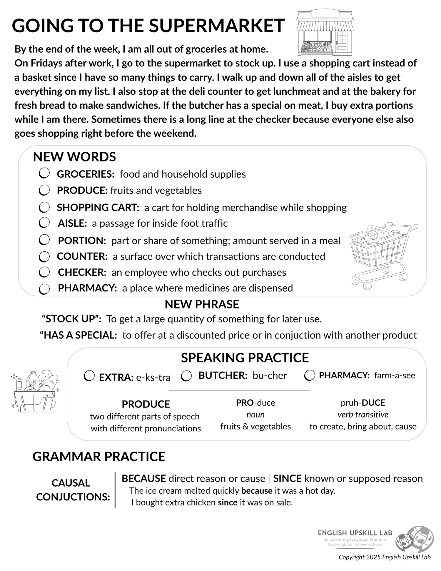 Complete English lesson in a 1 page black & white format for easy printing and tablet viewing. Great mobile study companions to the slide decks & YouTube lessons for studying on the go.