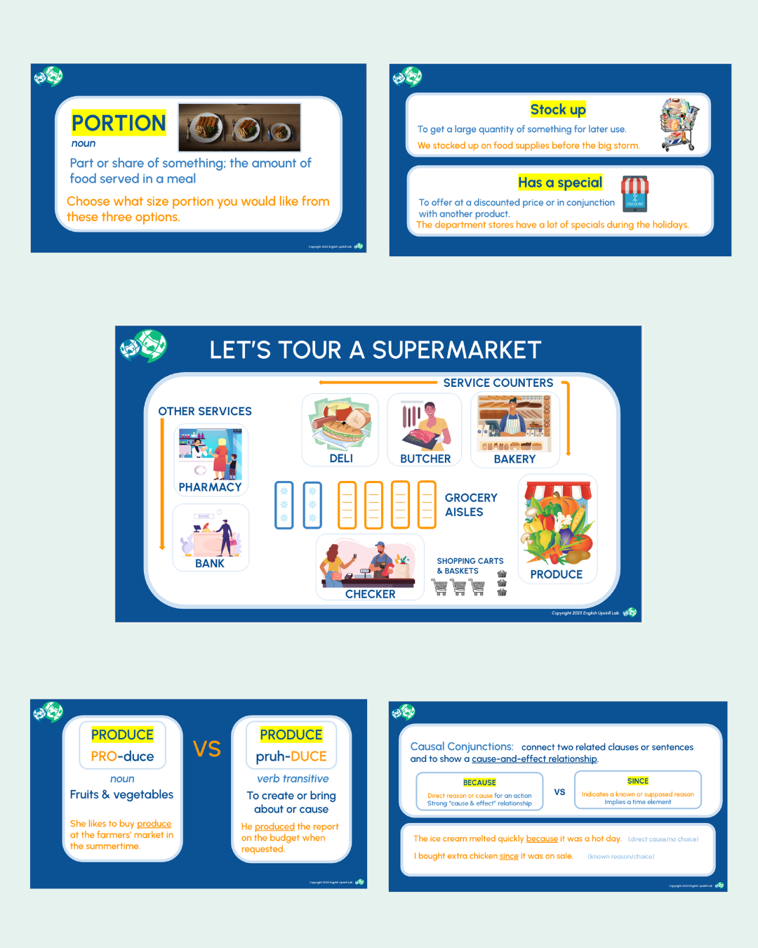 We combine our years of experience in communications design with TEFL-certified strategies to create ready-to-teach instructional slide decks and student study guides.